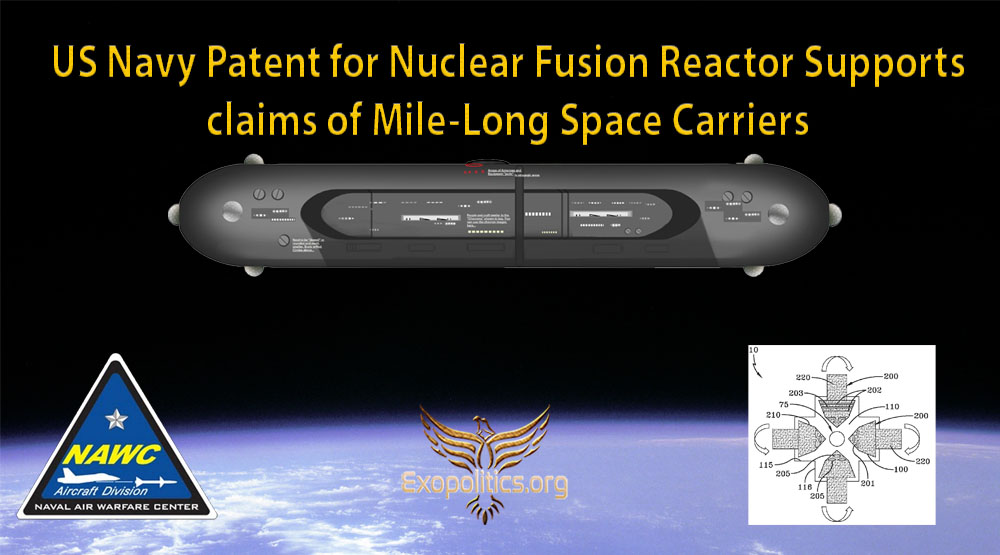 The US Navy has authorized the publication of a patent for a nuclear fusion reactor that can both generate enormous quantities of power and yet be small enough to be fitted on mobile platforms, including spacecraft. The patent’s publication supports Whistleblower/Insider claims of mile (1.6 kilometers) long space carriers that have been secretly built and deployed by the Navy since the late 1970s and early 1980s.